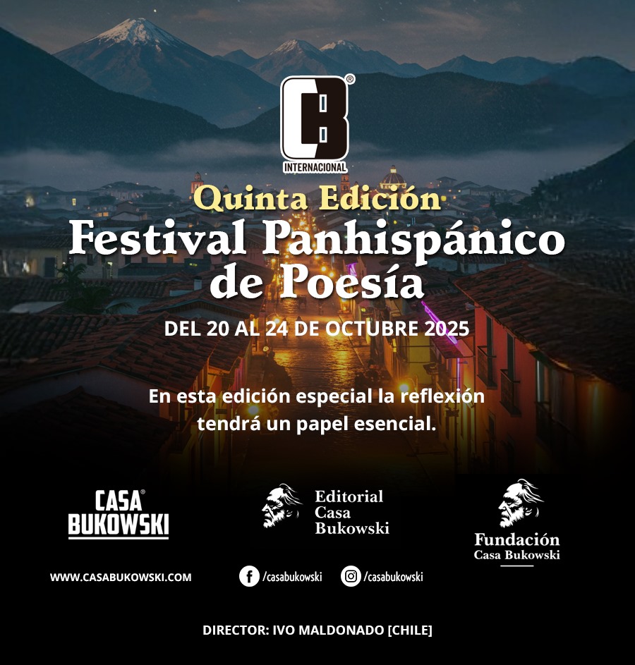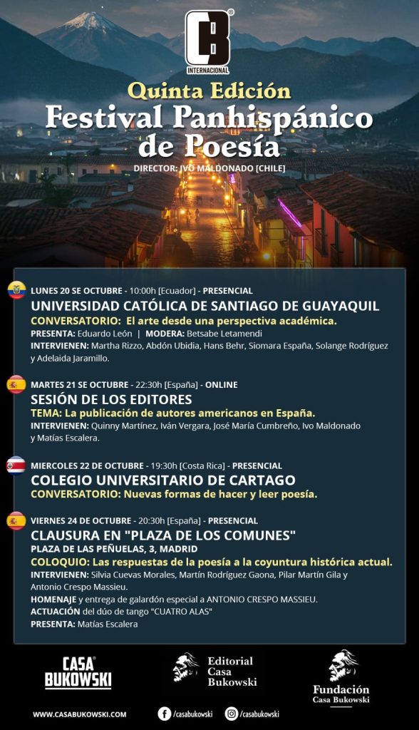 La Quinta Edición del Festival Panhispánico de Poesía, organizada por Casa Bukowski Internacional, se celebrará del 20 al 24 de octubre de 2025, conectando voces y territorios de América y Europa bajo un mismo eje poético y reflexivo. Con actividades presenciales y online en Ecuador, Costa Rica y España, el festival reafirma su propósito de crear un espacio panhispánico de diálogo y pensamiento crítico alrededor de la poesía contemporánea.