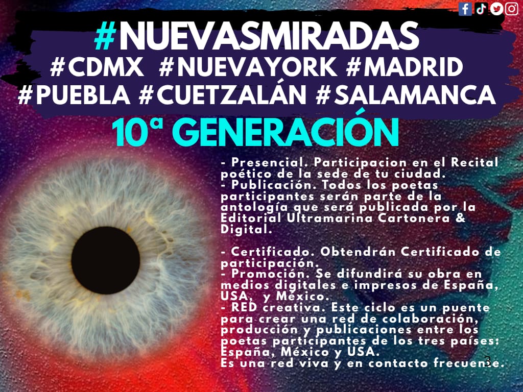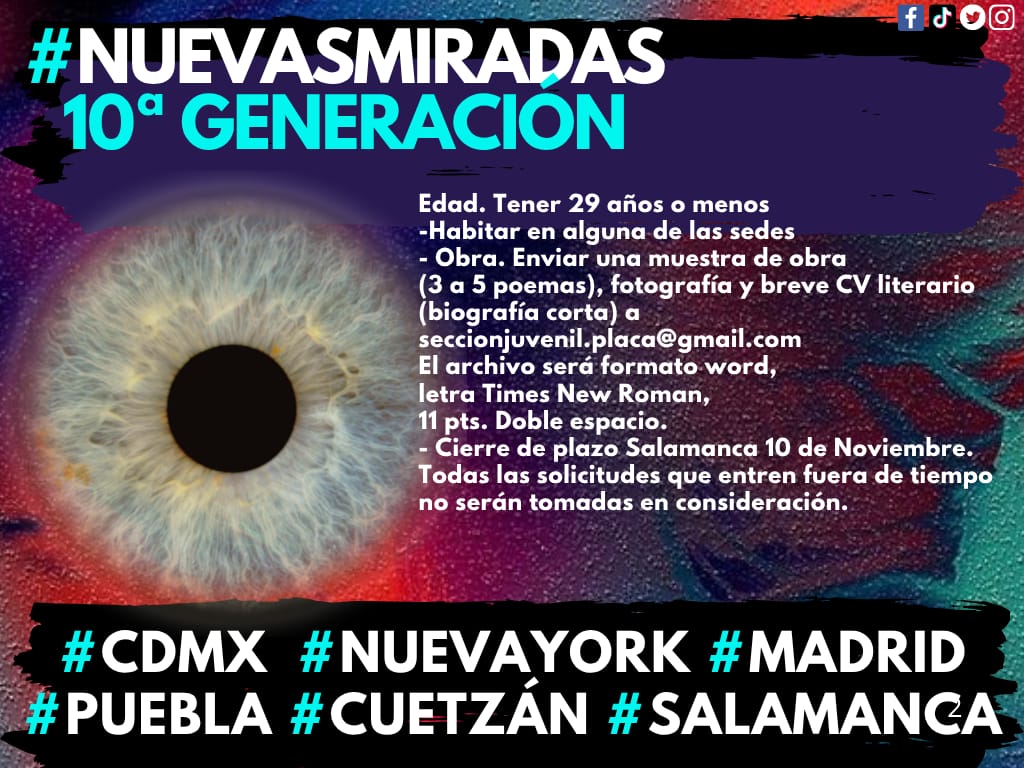 Nuevas Miradas es un ciclo de poesía y arte joven que se desarrolla en diversas ciudades del planeta. Participan poetas y artistas jóvenes de las respectivas ciudades, la mayoría de ellos sin haber pisado un escenario o con muy pocas publicaciones. Cada generación es coordinada por poetas que participaron en la anterior edición, logrando con ello darle continuidad al proyecto gracias a la colaboración voluntaria en la coordinación, producción y desarrollo del evento. @plataformaplaca se encarga de capacitar a estos coordinadores en todo lo que involucra preparar un proyecto de esta índole.